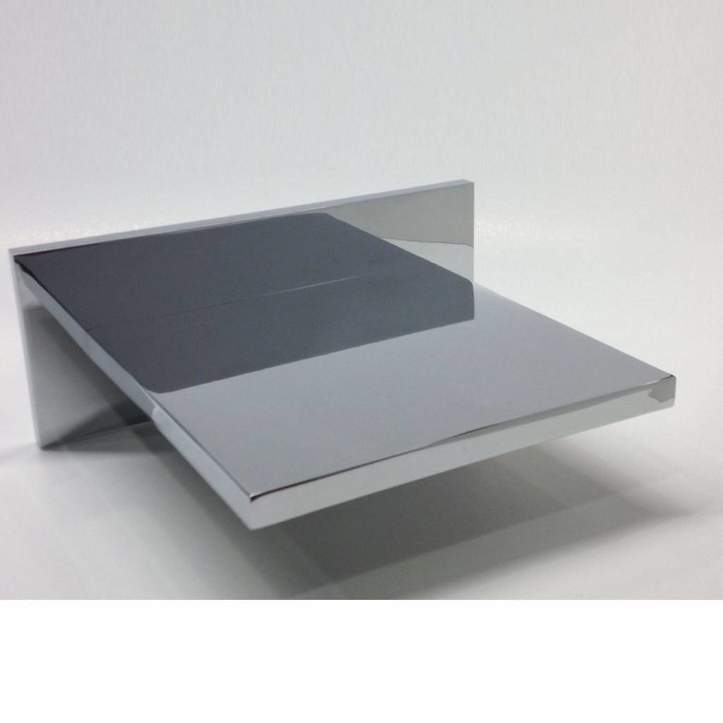 De breedte van de achterplaat is 18 cm met een hoogte van 7 cm. De uitloop zelf is 14 cm breed en heeft ook hoogte van 8 mm. Een heel plat uiterlijk dus dat de mogelijkheid biedt om iets er boven op te zetten.