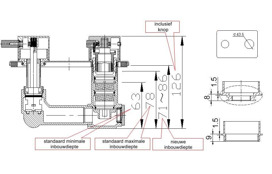 Oplossing wanneer het inbouwgedeelte van de inbouwdouchethermostaat 2 knops maximaal 8mm te diep in de muur is ingebouwd