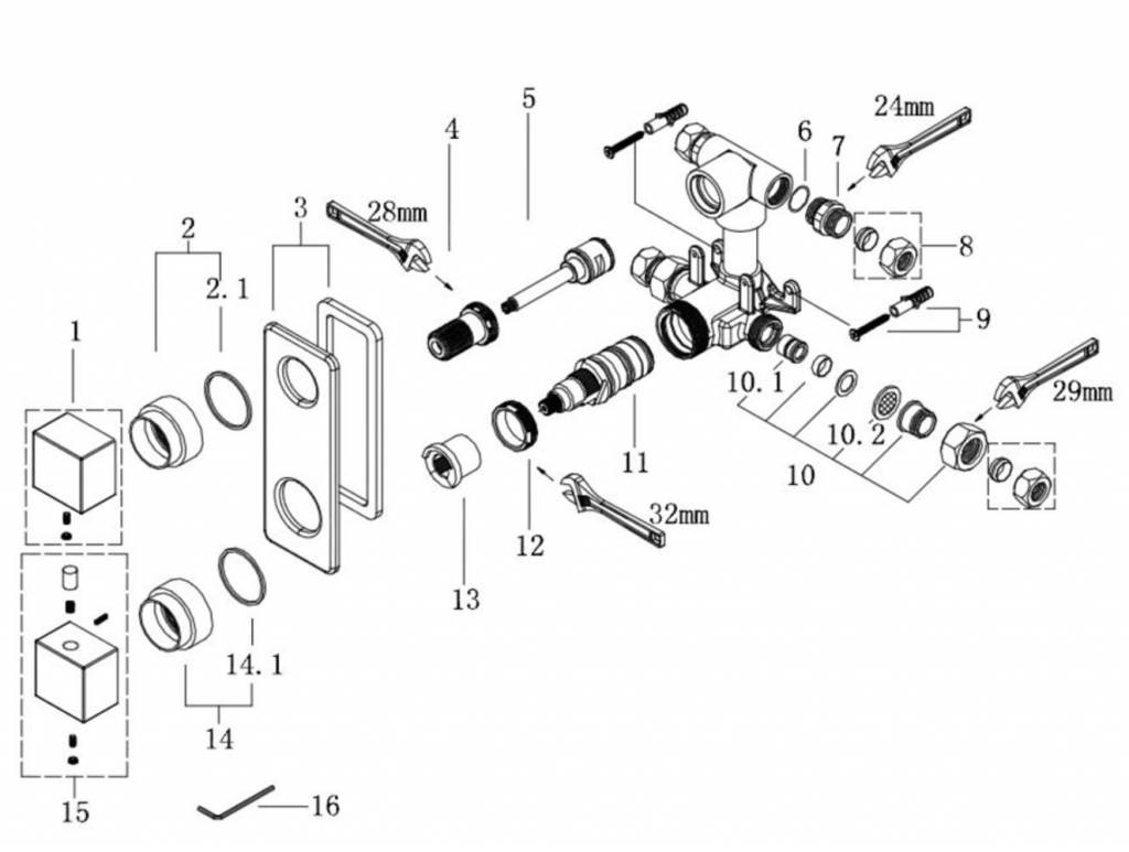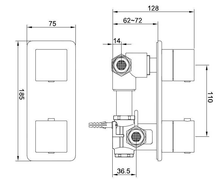 Rombo inbouw 2-wegs douchethermostaat rond chroom, Inbouwdeel compleet met afbouwdeel chroom, 2xknel 15mm aansluiting, Bodemplaat 75x185, -de onderste knop is de thermostaatbediening met begrenzer op 38 gr. -de bovenste knop keuze tussen hoofddouche en ha