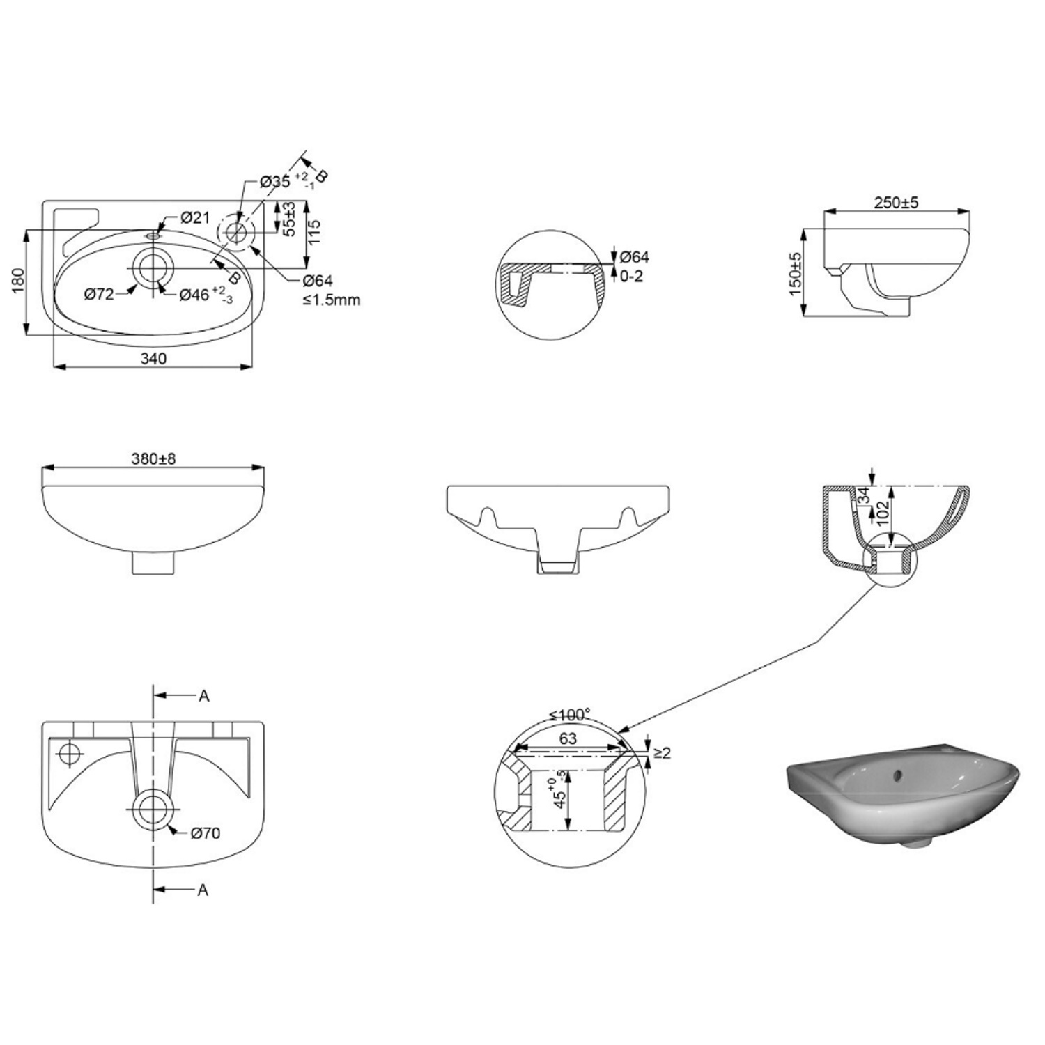 Trevi, keramisch fonteintje, 38x25, Kleur wit, Kraangat rechts, met overloop,