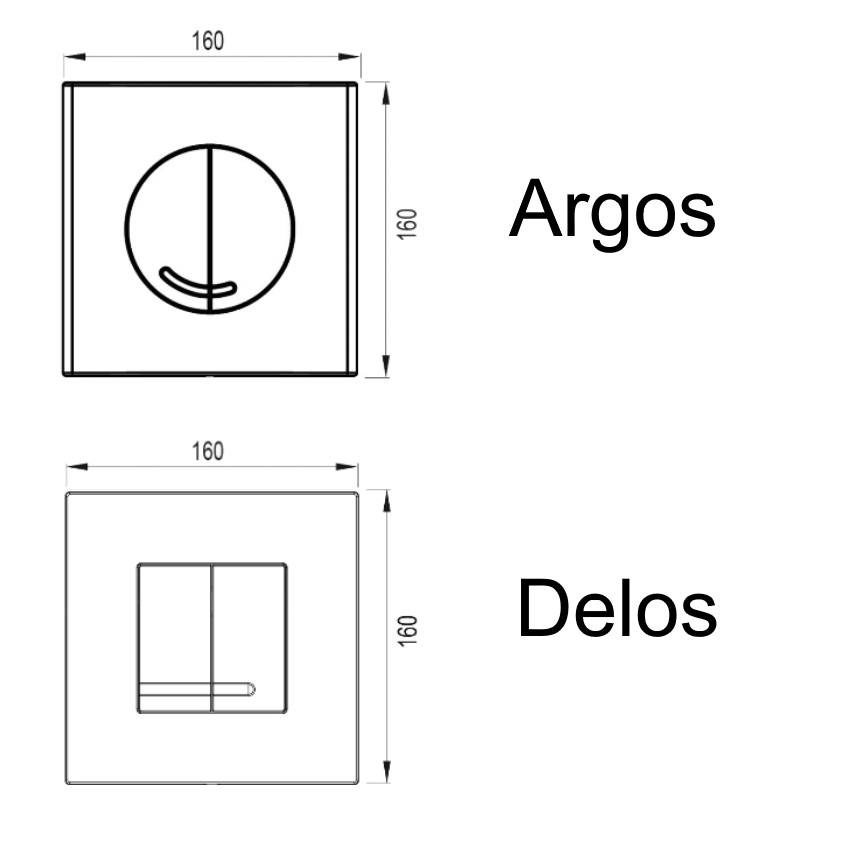 De drukplaten uit de Argos en Delos serie zijn vierkante drukplaten met verschillende 2-toets varianten. De Argos serie heeft ronde toetsen en de Delos serie vierkant. Alle drukplaten zijn voorzien van een waterbesparende 2 toets systeem. De linker knop is voor een grote spoeling. In te stellen tussen de 4,5 tot 7,5 liter water per spoelbeurt. De rechter knop is in te stellen tussen de 3 tot 4 liter water. Op die manier wordt er veel water bespaard wat goed is voor het milieu en voor uw portemonnee.