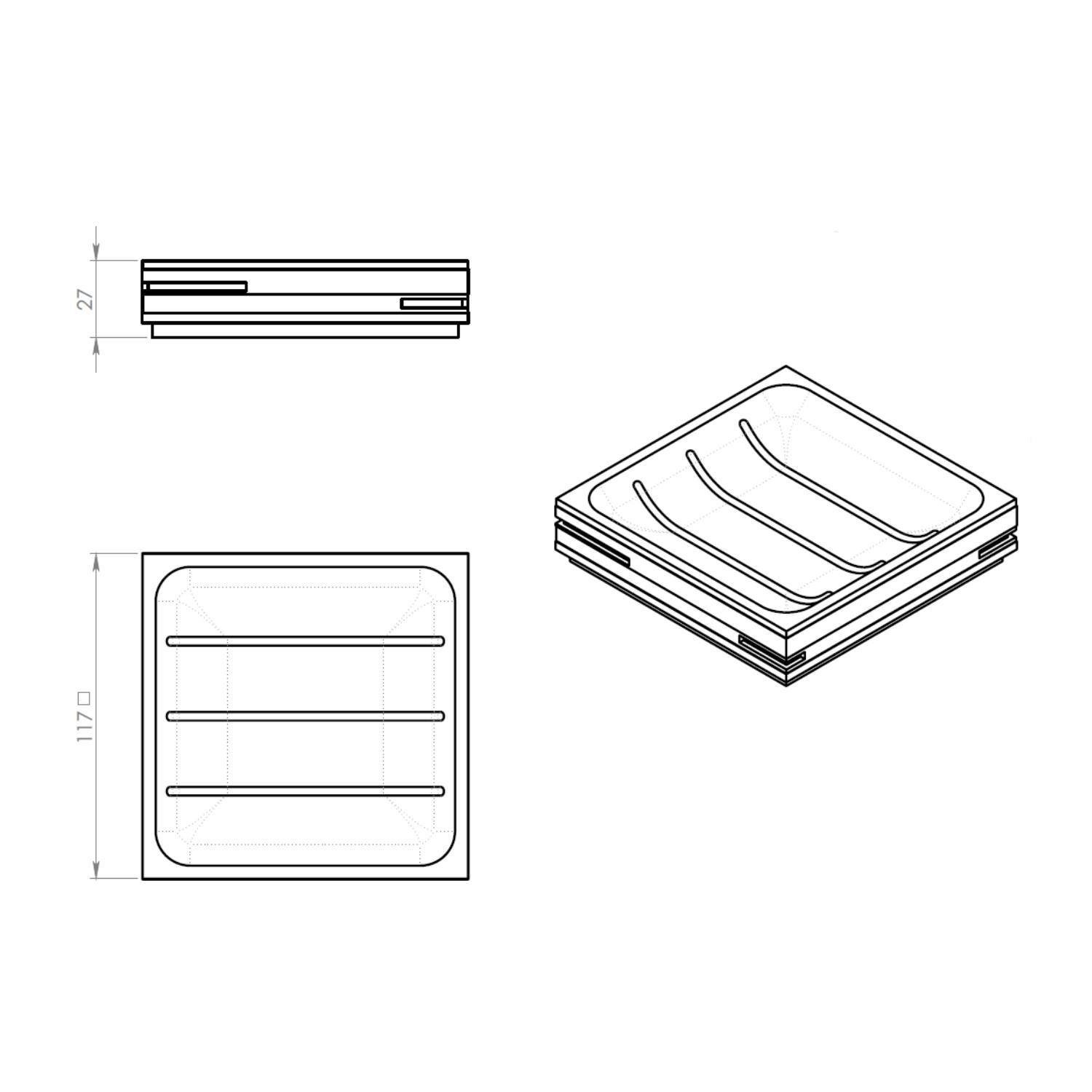 De zeephouder heeft een breedte van 11.7 cm, een diepte van 11.7 cm en een hoogte van 2.7 cm.