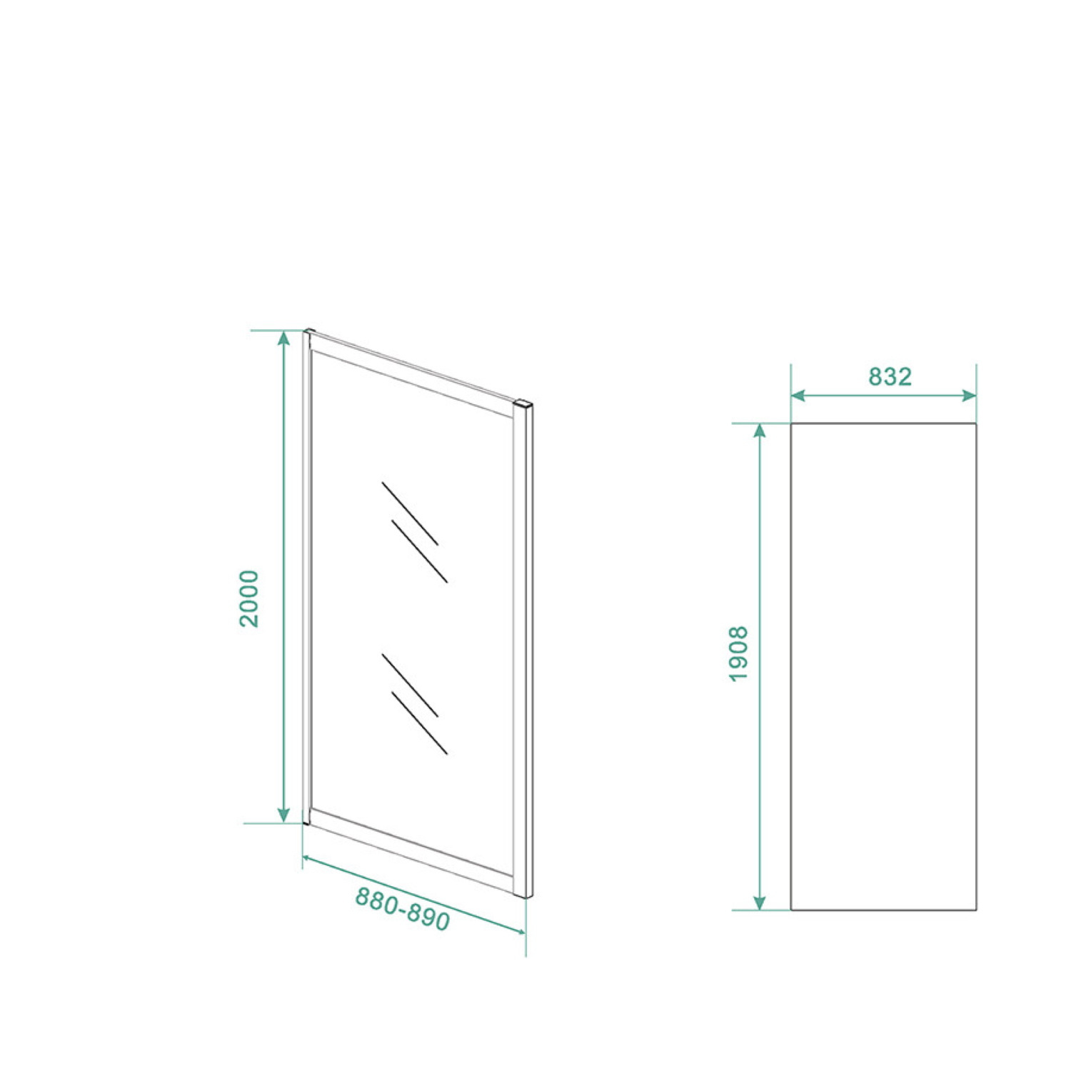 De Boss & Wessing zijwand is 90 cm breed, 200 cm hoog en heeft een glasdikte van 8 mm. De zijwand beschikt over veiligheidsglas met Nano coating. De inbouwbreedte van het glas is 88 - 89 cm. Het profiel is gemaakt van aluminium.